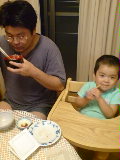 ある日の夕食。おかずはさしみ。すでに夕食を終えたはずのたいちが、仕事から帰ったおとうちゃんのおさしみ …
